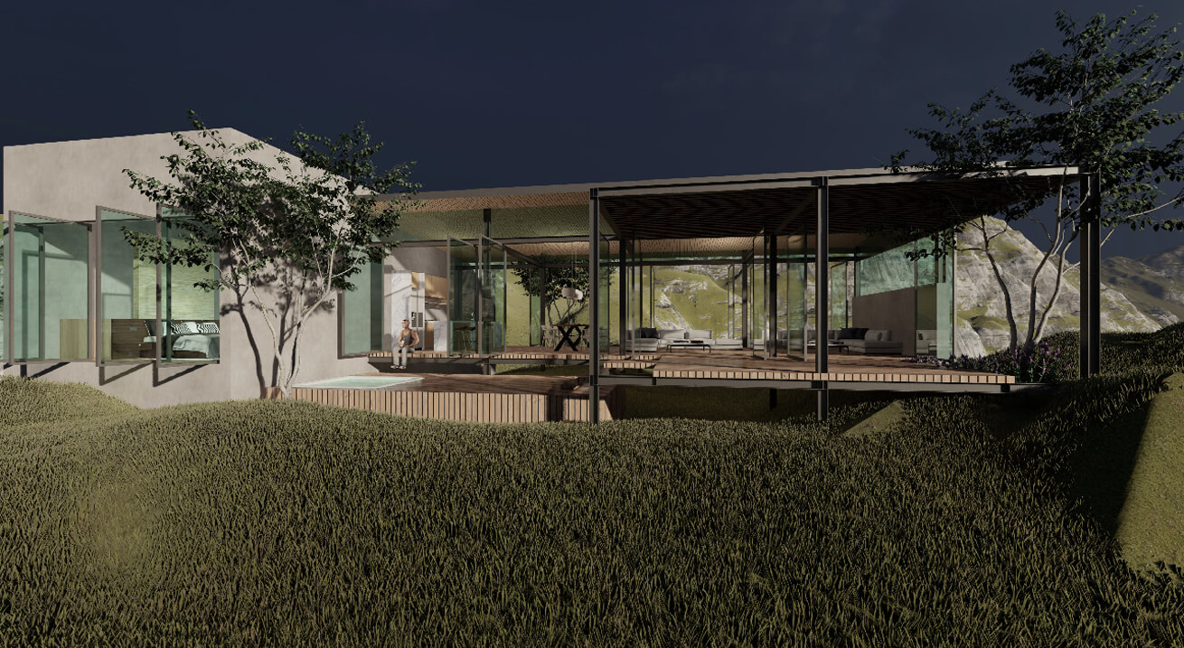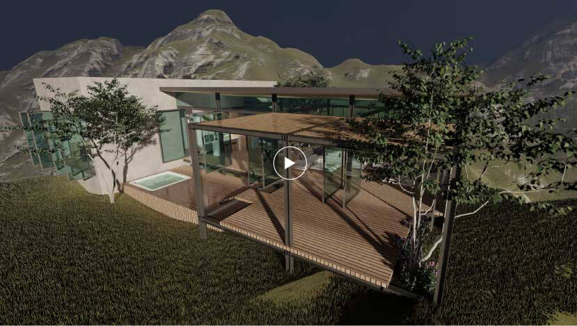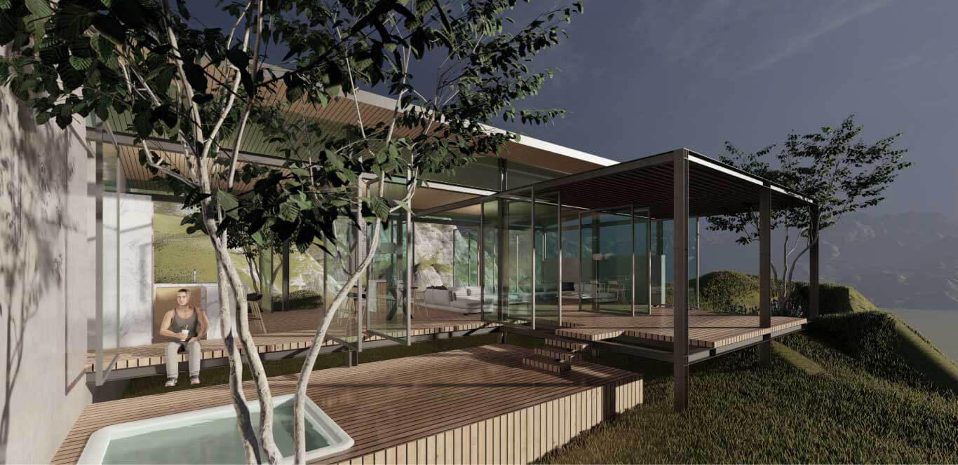 With an 800 sq. ft interior space of living, dining, and pantry that opens out to the exterior environment through glazed pivot windows and a 330 sq. ft semi-covered outdoor deck with a hot tub, you can soak in the beauty of the surrounding nature from the comfort of your home, as the breeze grace you with welcome notes.