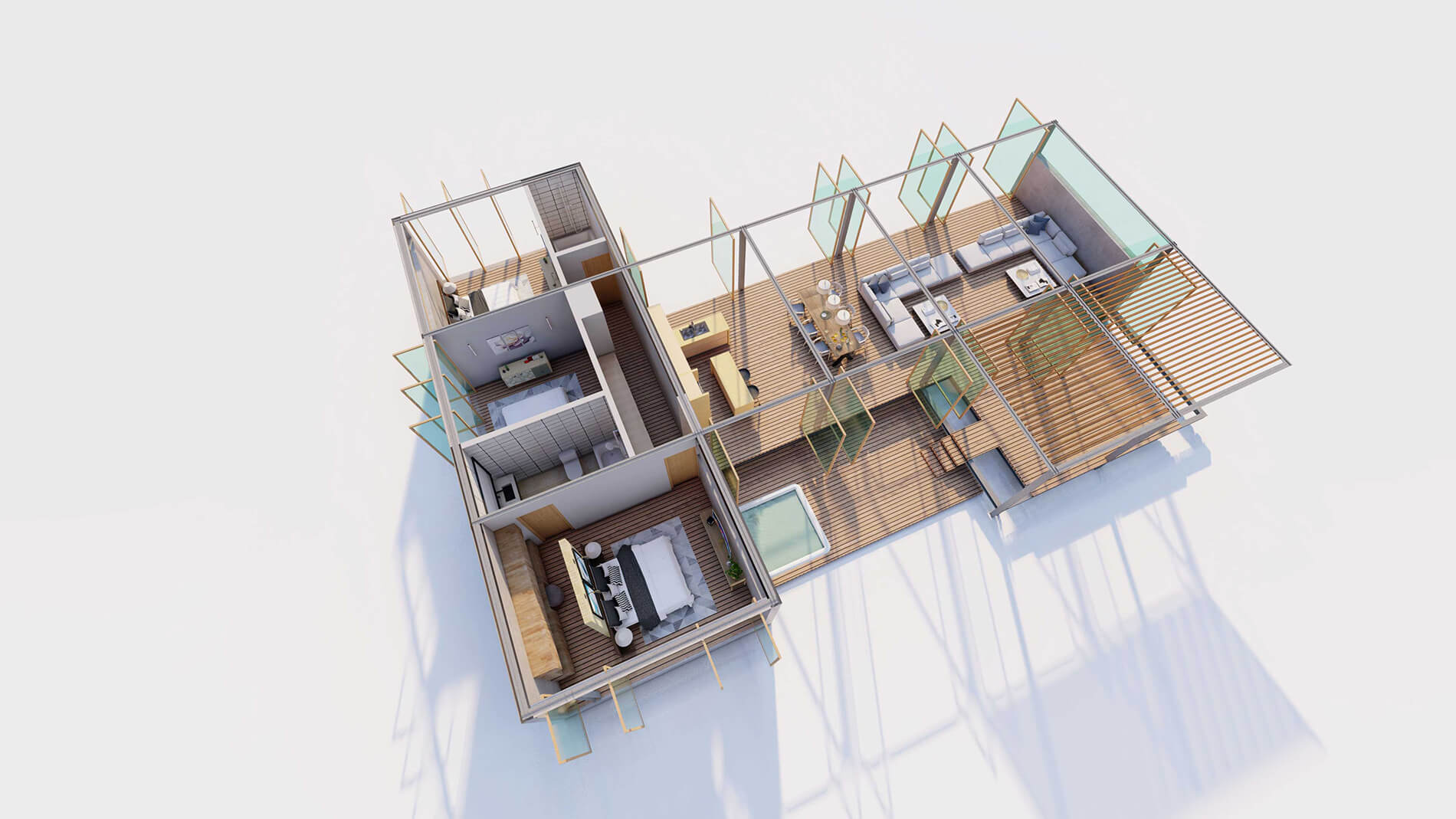 Amity is a three-bedroom space with a master suite that is elevated with an attached bathroom and a built-in closet, whereas the other two bedrooms come with a shared bathroom. And a utility space for ironing and laundry is not forgotten.
