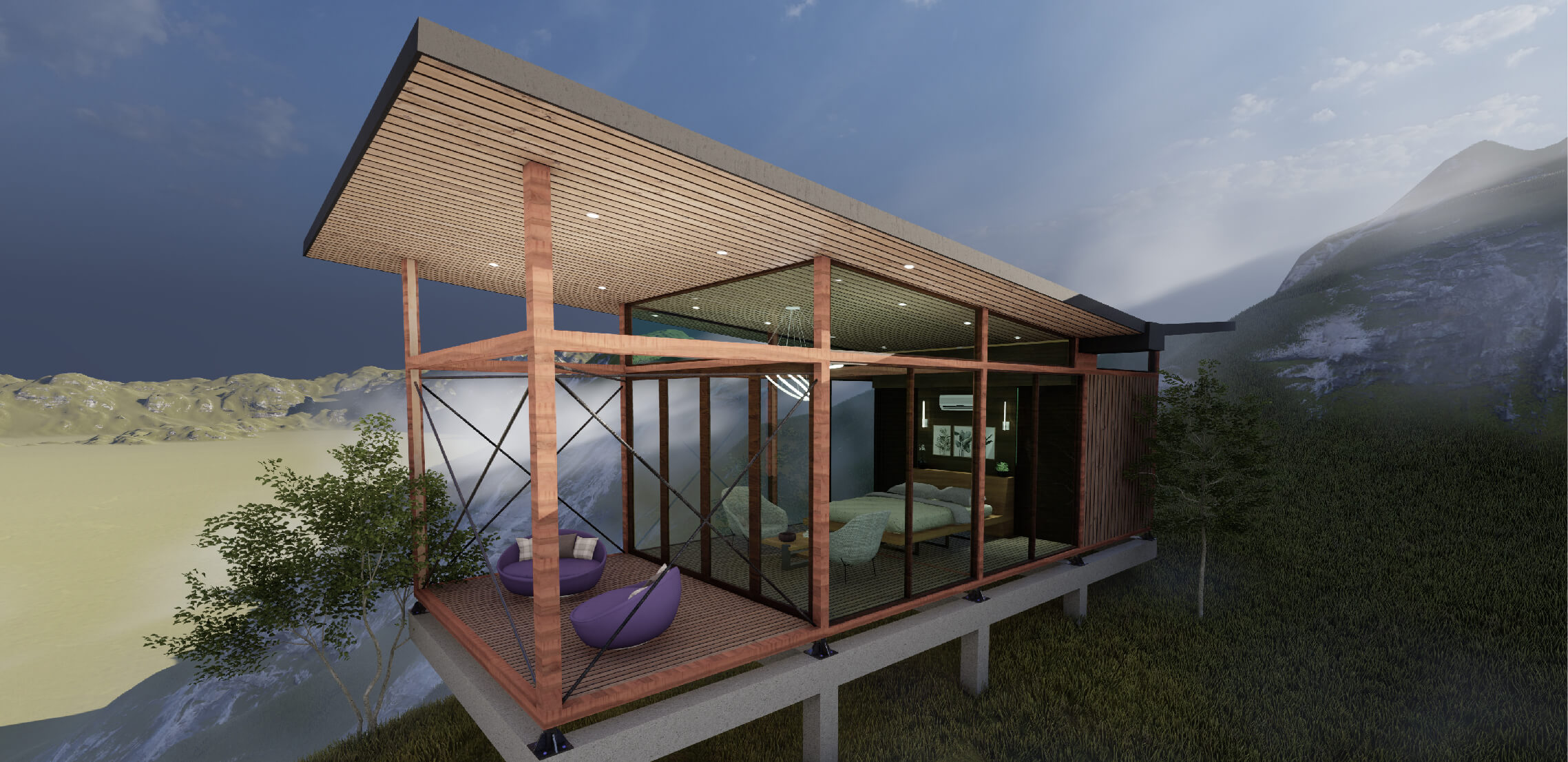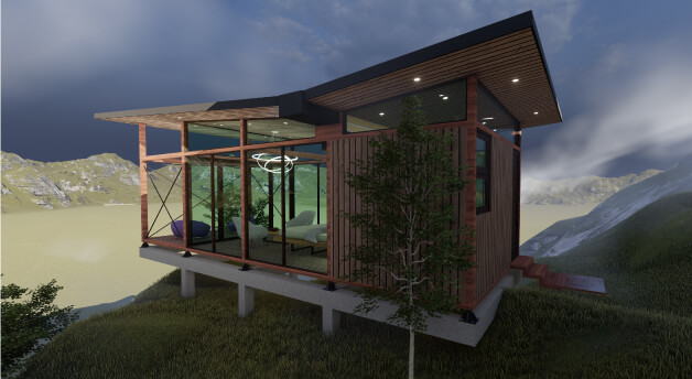A delightful 380 sq. ft cabana that is perfect as a relaxing holiday home for you and your family. This cozy cabana can be erected on many different sites including waterfronts, mountain ranges, or forest environments.