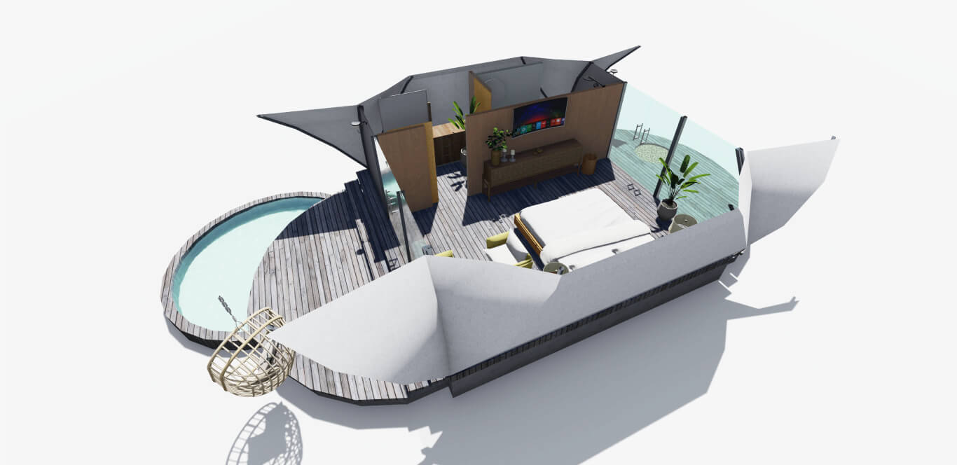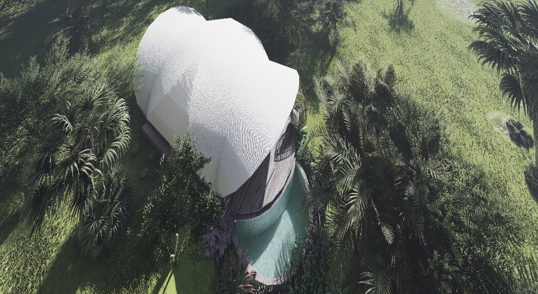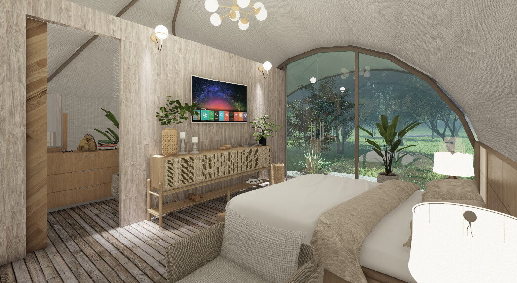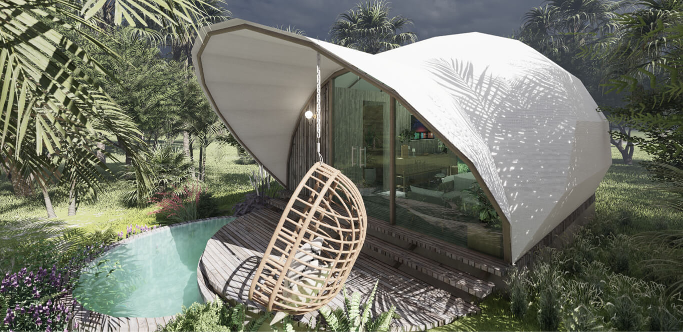 A cocoon-like cabin that hints at fashionable design innovations, Eden boasts soaring vaulted ceilings and full-height glass facades offering scenic jungle views.