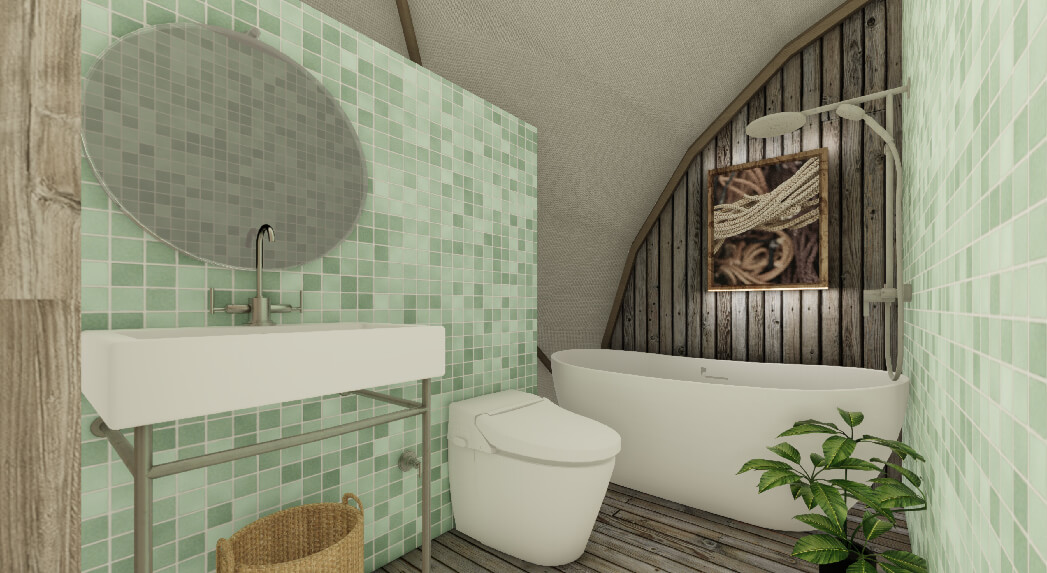 With a half-circled plunge pool inviting you to unwind in the pristine waters, and with two outer decks, Eden offers a spot to enjoy the luscious scenic views from both sides of the cabana. With a pantry, a contemporary-style bathroom, and a closet catering to your needs, this site-built cabana is an embodiment of serene luxury.