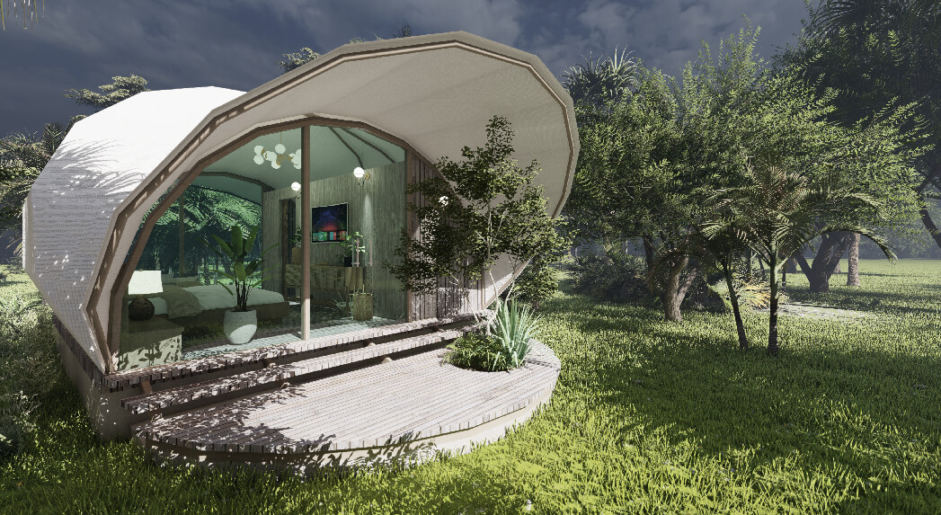A cocoon-like cabin that hints at fashionable design innovations, Eden boasts soaring vaulted ceilings and full-height glass facades offering scenic jungle views.
